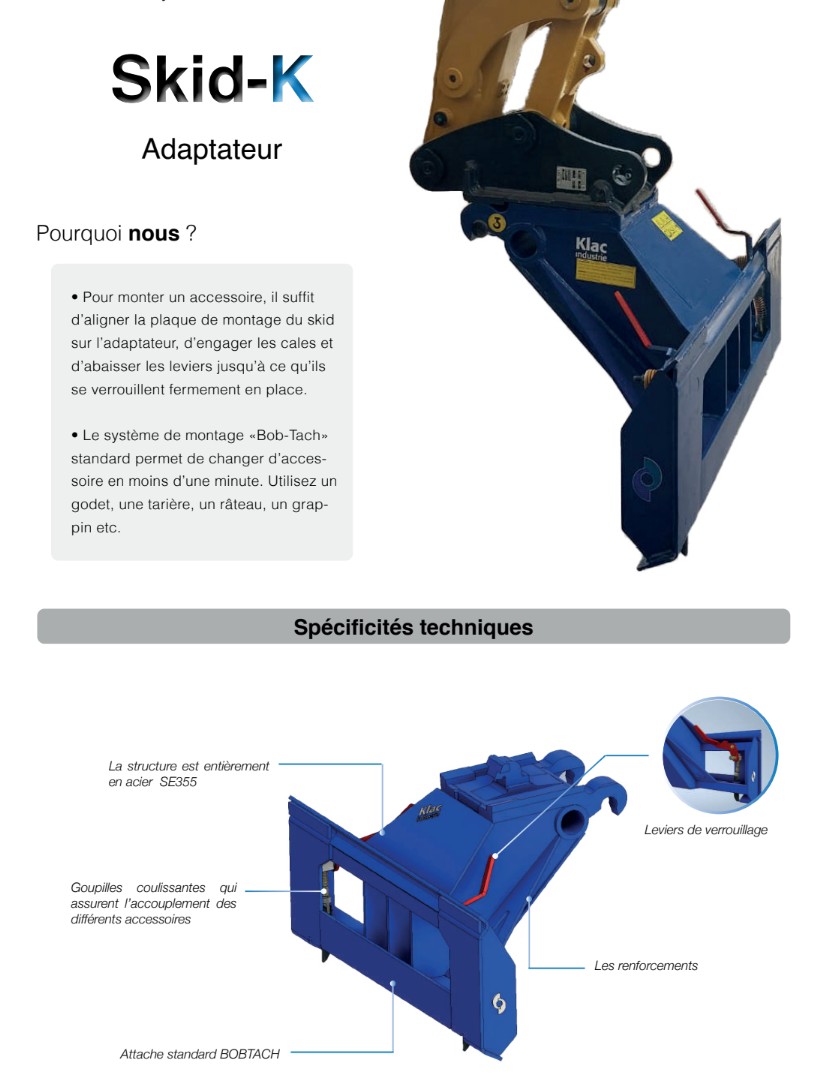 - Le système d'attache Skid-K standard permet de changer d'accessoire en moins d'une minute. Utilisez un godet, une tarière, un râteau, un grappin etc.