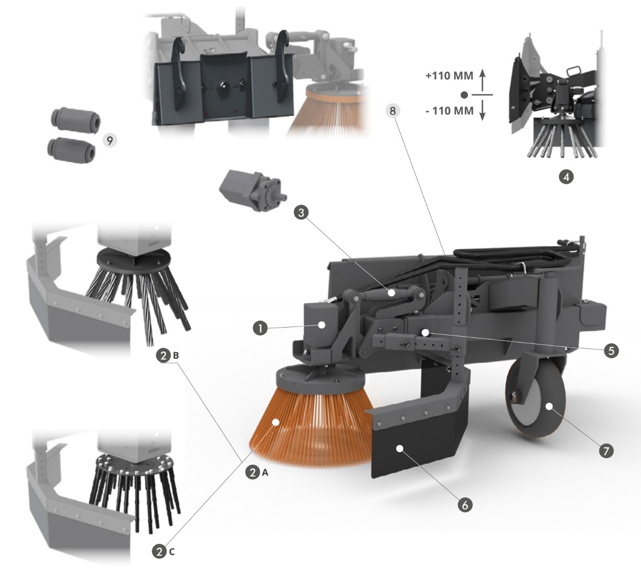 La brosse frontale peut être facilement montée à droite et à gauche, ce qui permet de nettoyer les deux côtés de la route.