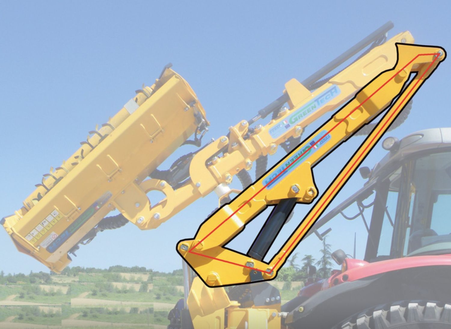 Débroussailleuse hydraulique avec bras d'extension de 8,9 mètres, pour tracteurs de 150/200 CV et poids de 7000 kg, idéale pour les travaux lourds de remise en état des terres et de tonte des routes, robuste, compacte, accrochée haut sur le tracteur et rapide à déplacer.