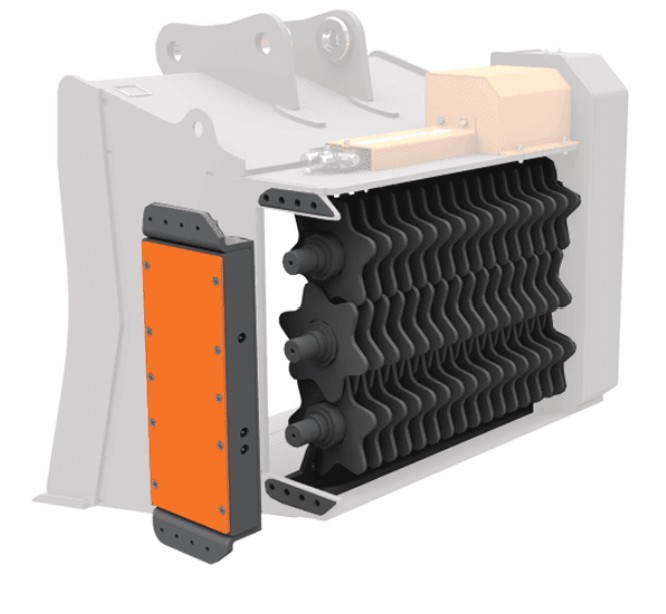Le godet cribleur Cangini série V dispose d'un système breveté permettant de démonter et de remplacer le groupe de criblage sans avoir à intervenir sur les organes de transmission, impliquant ainsi les temps et les coûts de maintenance.