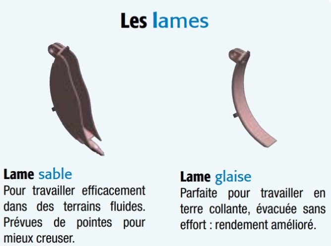 - Vidange du godet facilitée par l'absence de joues (lames glacées)