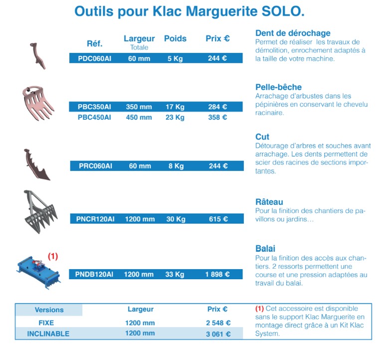 La mini pelle a beaucoup fait sur les chantiers depuis 20 ans pour mécaniser certaines tâches et les rendre moins pénibles. L'idéal serait bien sûr de rendre votre équilibre aussi agile qu'une main ! Pour saisir, par exemple, une pelle, un râteau, une bêche, un balai, … c'est très exactement ce que vous proposez Klac marguerite, un véritable porte-outil !